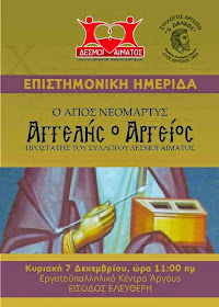 Επιστημονική Ημερίδα με θέμα "Αγγελής ο Αργείος" διοργανώνει ο Σύλλογος Εθελοντών Αιμοδοτών "Δεσμοί Αίματος" στο Εργατικό Κέντρο Άργους, την Κυριακή 7 Δεκεμβρίου στις 11 το πρωί σε συνδιοργάνωση με τον Σύλλογο Αργείων «Δαναός».
